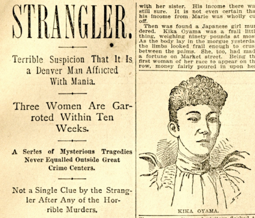 The most apparent evidence of strangulation came when the surgeon found several blackish-red patches in the windpipe area. Nervous Denverites imagined White Chapel’s Jack the Ripper wandering the Row.