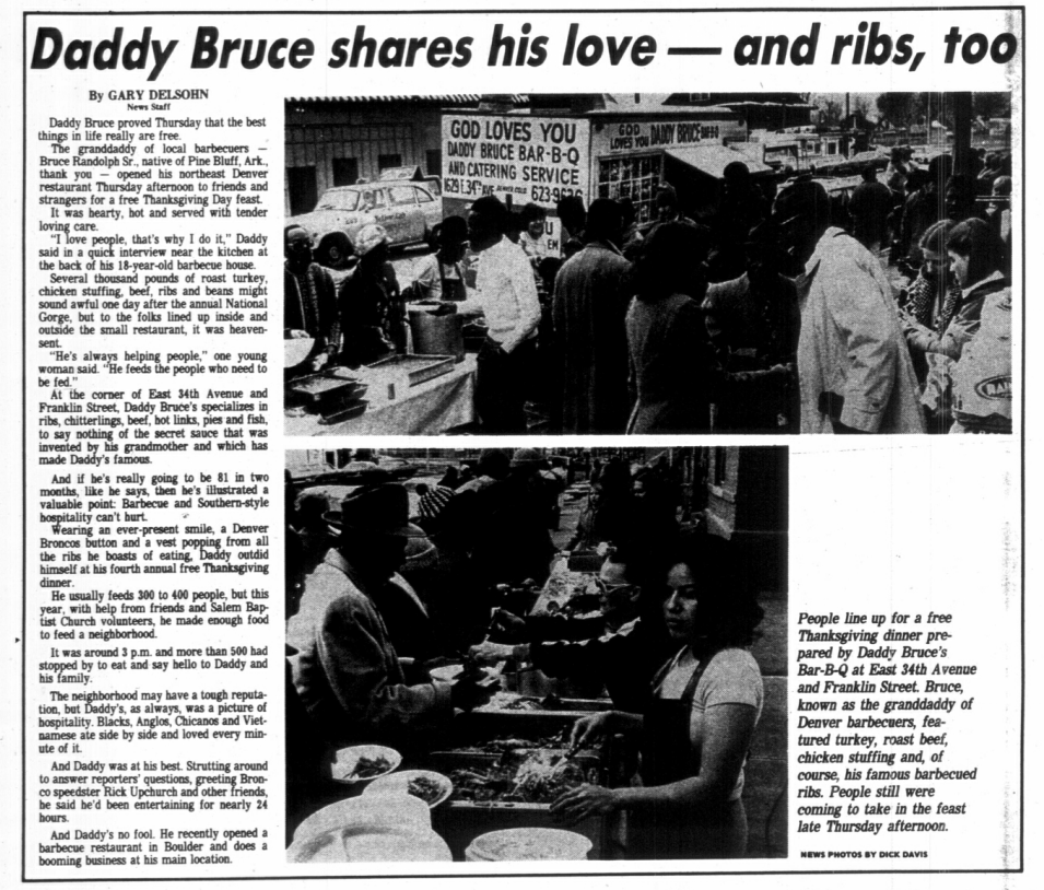 Thanksgiving meals included turkey, traditional appetizers, and his famous barbecue. Denverites from all over the city would come to his restaurant knowing they would get a free meal.