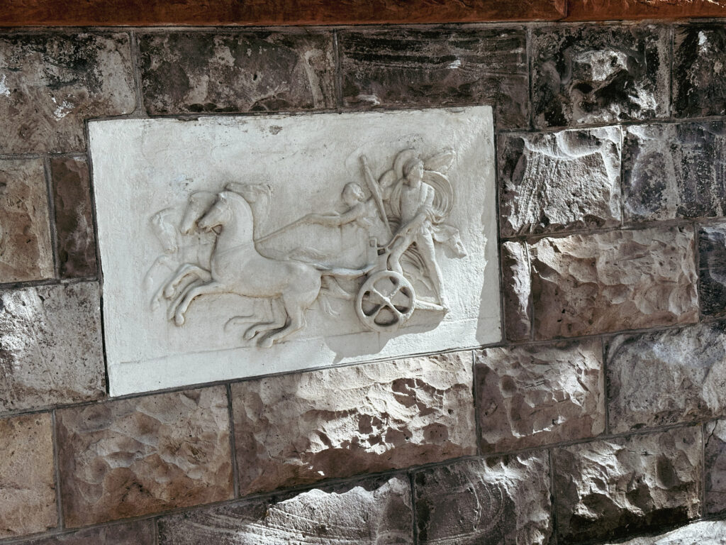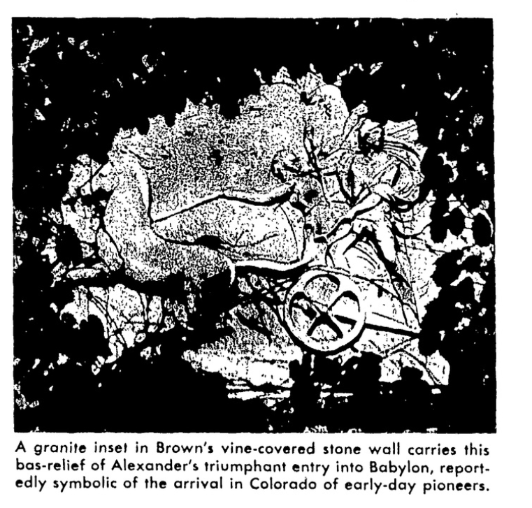 “But one of the most unusual features of the home remains intact in a granite inset of the old stone fence. All but hidden in the summer by the clinging vines is a bas-relief, reproducing in part a frieze by the famous Danish sculptor, Thorwaldsen, representing the triumphal entry of Alexander into Babylon. While he stands in the chariot, scepter in hand as an emblem of the imperial power, a woman representing Victory drives the horse. The original sculpture is in Copenhagen.”
