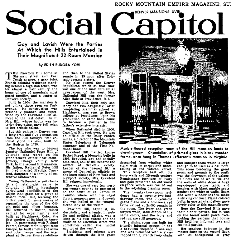 At one end of the Denver social spectrum was Louise Sneed Hill, a Southern belle who married Crawford Hill in 1895.